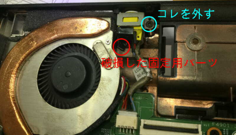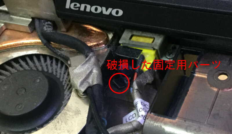 症状:ノートPCの本体側の電源コネクタが本体内部に落ち込むようになってしまったため,接続が出来ずに給電できなくなった。 対処:本体を分解し,電源コネクタを適切な位置にボンドなどで固定する。 という対処を・・・2年前に一度やったわけですが,それと同じ状況が別の機体で発生したため,分解修理することになりました。 Lenovo製品なので,整備マニュアルが公開されているおかげでこんな事も出来るわけですが。 ①:バッテリーを外す。 ②:裏蓋を外す。 ③:HDDを取り外す。 ④:光学ドライブを取り外す。 ⑤:キーボードを取り外す。 ⑥:アンテナ線を外し,無線LANのモジュールを取り外す。 ⑦:本体カバーを取り外す。 となったところで,電源コネクタ部分が見えました。 あぁ,やっぱり本体側でコネクタを保持するためのパーツが破損してます。 このままでは作業しにくいので,続けてディスプレイを本体から取り外します。 で,作業開始。 黄色の本体側コネクタを押さえているパーツのネジ(水色の○)を外すと,コネクタが取り外せるので,一度外します。 赤丸の部分のパーツが破損しているので,外からの力でコネクタが内側に動いてしまいます。 そこで,ボンドで固定することにします。 ボンドを適量塗りつけて,元通りに取り付けます。 そのまま,説明書に書いてある硬化に必要な時間に15分程度余裕を見た時間放置して,それなりに固定されているのを確認してから,分解した手順の逆で組み立て。 そして,ACアダプタからのケーブルを接続・・・手応え的に,ちゃんと固定されているようです。 電源ボタンを押すと・・・起動しました。 しかし・・・こんな対処の2度目があるとは思わなかったなぁ(苦笑) PR